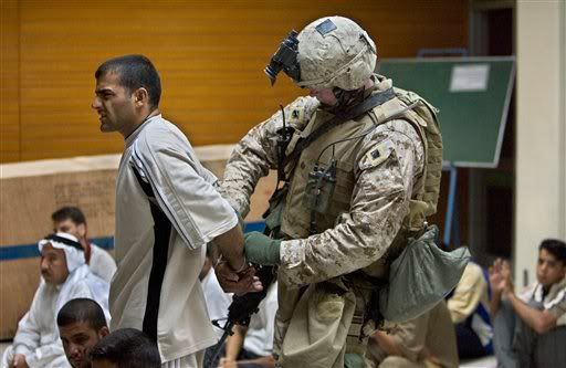 A U.S. Marine handcuffs a man, who was later released, at the General Hospital in Ramadi, 115 kilometers (70 miles) west of Baghdad, Iraq, Wednesday, July 5, 2006. U.S. and Iraqi seized control of the hospital that they believed insurgents were using to stage attacks. (AP Photo/Jacob Silberberg)