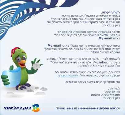 "במסגרת השיפורים הטכנולוגיים, אותם עורכת בזק בינלאומי באופן מתמיד, אני שמח לעדכנך כי החל מה-17.7.06 ייכנס לתוקפו שיפור נוסף בשירות הדוא"ל של בזק בינלאומי", כותב ערן קריסטל, סמנכ"ל שירות לקוחות בבזק בינלאומי.