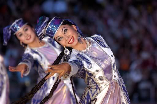 Women wearing traditional Uzbek costumes dance during an official celebration in Tashkent, late Thursday, Aug. 31, 2006. Uzbek President Islam Karimov, who was Uzbekistan's Soviet-era Communist Party boss, has ruled the nation of 26 million with an iron fist since 1989, cracking down on political foes and dissident voices. U.S. ties with the Central Asian nation of Uzbekistan soured after its hard-line government brutally suppressed an uprising in May 2005 in an eastern city. Karimov rejected calls for an international probe into the bloodshed and expelling the American military from a base that had been used for operations in neighboring Afghanistan. (AP Photo)