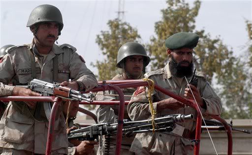 Pakistani paramilitary soldier stands alert on a vehicle to ensure the security during a strike called by Pakistani opposition parties to condemn the killing of rebel tribal chief Nawab Akbar Bugti, Friday, Sept. 1, 2006. Pakistani authorities buried a locked coffin believed to contain the body of a tribal chief whose killing in a military raid sparked widespread protests, officials and witnesses said. (AP Photo/Shakil Adil)