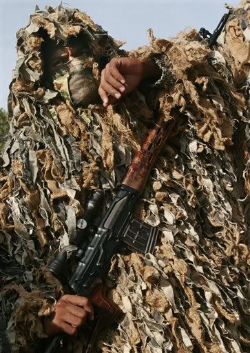 A member of Nicaraguan Army's Special Forces participates in military exercises in celebration of the 27th anniversary of the founding in Xiloa, 22km (13 miles) north of Managua, Nicaragua, Firday Sept, 1, 2006. (AP Photo/Esteban Felix)