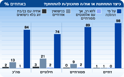 חלק מהשאלות עסקו בנושא חיי האישות והמשפחה. מסתבר, כי למרות מה שנראה כפריחה של נושא הנישואים האזרחיים או האלטרנטיביים, רוב מוחלט של הישראלים מעדיף את האופציה האורתודוכסית. לשאלה "כיצד התחתנת או אתה מתכוון להתחתן?" השיבו רוב אדיר של 84% "על פי ההלכה". רק 13% יעשו זאת בנישואים אזרחיים, ואחוזים בודדים ישקלו להתחתן "ללא רב אך עם מאפיינים מסורתיים" או לחיות עם בן זוג ללא נישואים. 74% מהחילונים מעדיפים חתונה על פי ההלכה, ורק 21% חתונה אזרחית.