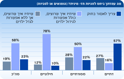 ומה לגבי זוגות חד מיניים שרוצים להתחתן? על פי סקר ynet ומכון סמית, 23% מהנשאלים היו בעד לאסור בחוק על זוגיות חד מינית, רוב של 58% תומך בזוגיות כזו הכוללת את הזכות לגדל ילדים ו-19% מבקשים למנוע את הזכות של זוגות חד מיניים לגדל ילדים, אם כי "שיחיו כפי שהם רוצים". ואילו רק בקרב החילונים, 78% מוכנים לזוגיות חד מינית הכוללת גידול ילדים לעומת 10% ששוללים זאת על הסף ו-12% המתירים זאת, ללא גידול ילדים. 50% מהמסורתיים ו-16% מהדתיים פתוחים למשפחות חד מיניות היכולות לגדל את ילדיהן.