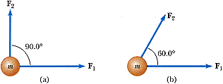 2) שני כוחות, F1 ו- F2, פועלים על גוף שמסתו 9.00 ק"ג, כאשר F1 = 35.0 N ו- F2 = 12.0 N