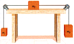 3) שלוש מסות m1 = 7.0 kg, m2 = 10.0 kg, ו- m3 = 12.0 kg, מחוברות בחוטים, העוברים על גלגילות חסרות מסה, כמתואר באיור. פני השולחן חלקים והמערכת משוחררת ממנוחה.