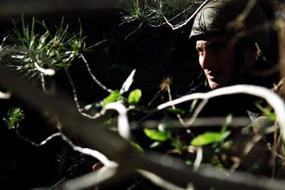 A U.S. Army National Guard Soldier watches the U.S. border with Mexico as a member of an entry identification team near Nogales, Ariz., Jan. 17, 2007. National Guard Soldiers and Airmen participating in operation Jump Start are acting as the eyes and ear s for the Border Patrol in securing the border. (U.S. Army photo by Sgt. Jim Greenhill)