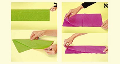 שלב א': פותחים אחת מהמפיות הוורודות ומקפלים אותה לשניים, ואחר כך שוב לשניים, כך שנוצר מלבן. שימו לב לתמונה: הקיפול במפית פונה למעלה
