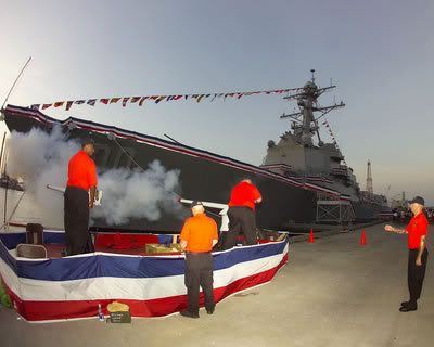 After getting the order from ship's sponsors Regina Kidd Wolbarsht and Mary Corrinne Kidd Plumer to "man our ship and bring her to life, "the officers and crew with a response of "aye, aye ma'am," double-timed it through the crowd to take their positions on the ship.
