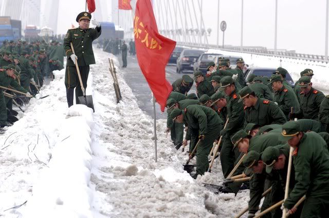 Paramilitary soldiers clean the snow off the lanes on a bridge across Yangtze River in Nanjing in east China's Jiangsu province, 29 January 2008. Hundreds of millions of Chinese are expected to travel for the Spring Festival family reunion, stretching China's transportation infrastructure to the limits