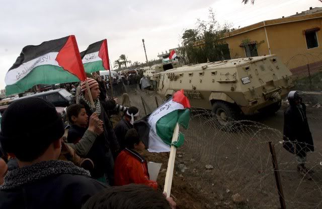 Palestinian boys hold Palestinians flags during a rally at the border between Gaza Strip and Egypt, in the southern Gaza Strip on 29, January, 2008