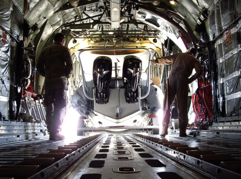 U.S. Navy sailors off load a rigid hull inflatable boat from the inside of a C-130 Hercules aircraft at Ali Al Salem Air Base, Kuwait, on Jan. 6, 2008. The sailors are attached to Commander, Task Force 53. DoD photo by Petty Officer 2nd Class Kelvin Surgener, U.S. Navy. (Released)
