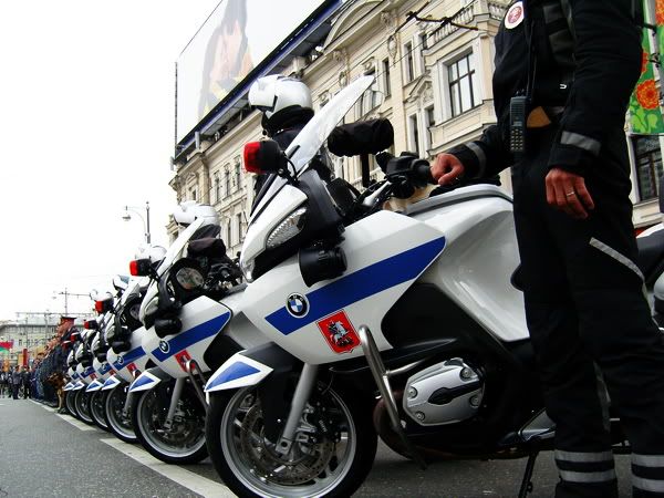 Road police officers staying the line during the ceremony of opening yearly 38-th Police relay race dedicated to 860-th anniversary of Moscow foundation