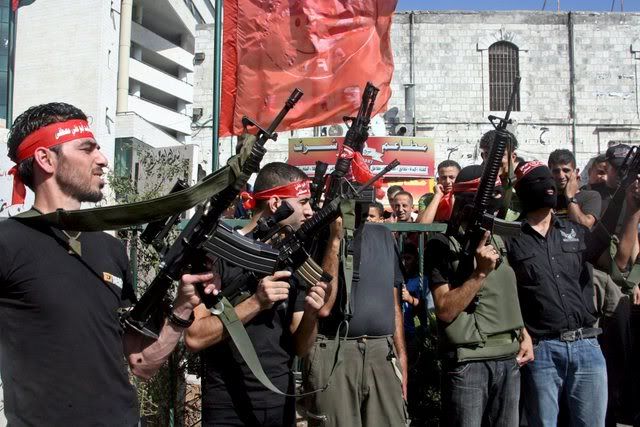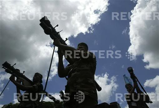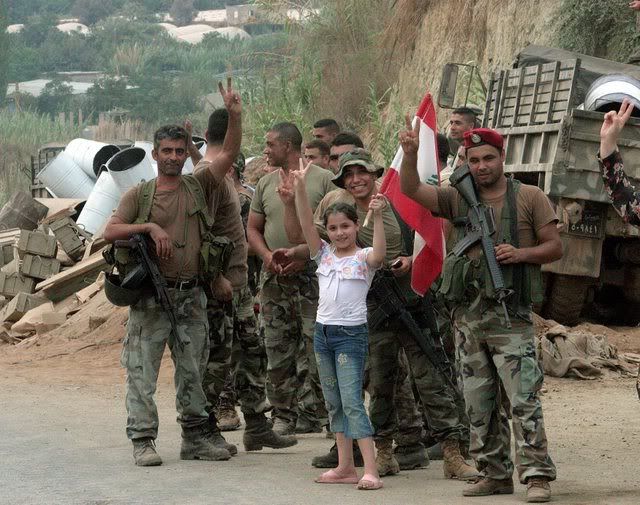 Lebanese soldiers shoot their rifles as celebrate the control over the Nahr al-Bared refugee camp in north Lebanon September 3, 2007. Lebanese troops on Sunday seized control of a Palestinian refugee camp where they had been battling militants for more than three months, killing at least 31 fleeing fighters, security sources said. REUTERS/Fadi Ghalioum (LEBANON)