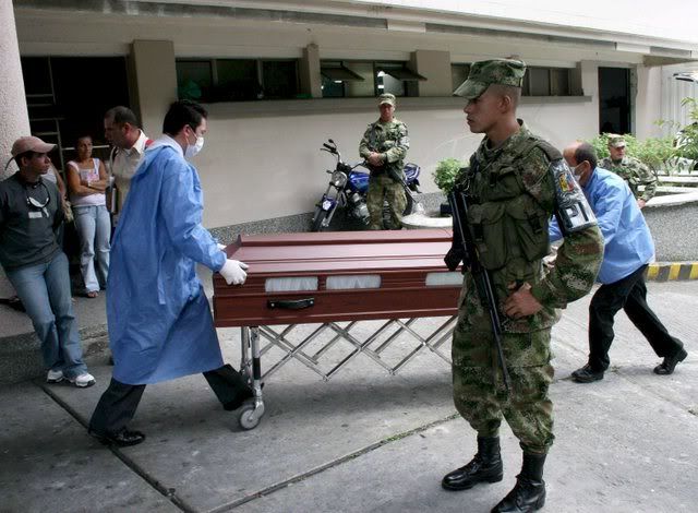 The body of one of the ten Colombian soldiers from the Eighth Brigade's Alta Montana battalion who died 02 September 2007, during an ambush with the guerillas from the Revolutionary Armed Forces of Colombia (FARC) is transferred, 03 Septeember 2007, from the San Juan de Dios University hospital in Armenia, Colombia