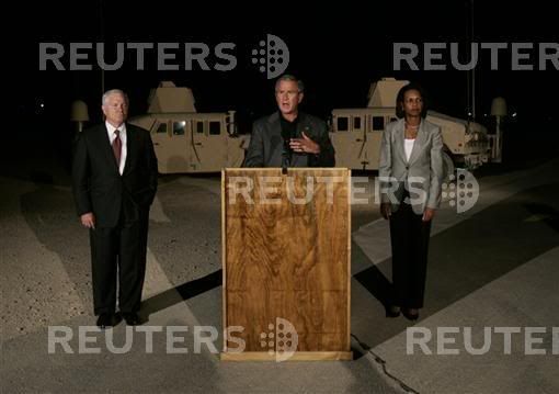 U.S. President George W. Bush (C) speaks to the press alongside Defense Secretary Robert Gates (L) and Secretary of State Condoleezza Rice after nightfall at Al-Asad airbase in Anbar Province September 3, 2007