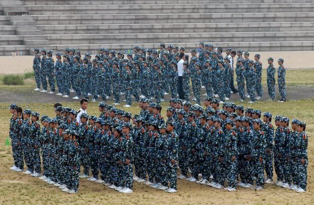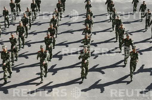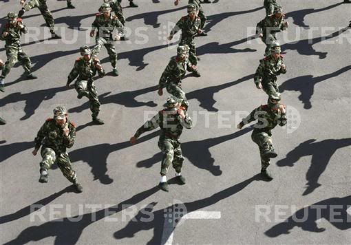 Paramilitary policemen take part in a training exercise at an army base in Shenyang, northeast China's Liaoning province September 3, 2007. China said on Sunday its military would participate in U.N. programmes on spending and conventional weapons inventories, a bid to address international concern about the rapid build-up of its opaque armed services
