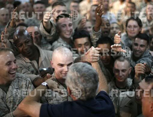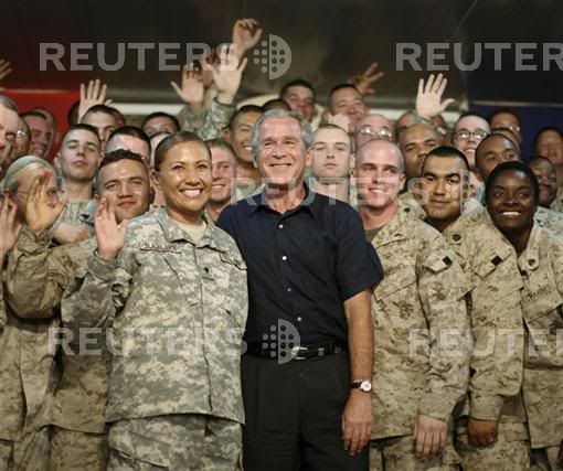 U.S. President George W. Bush poses with troops after addressing them during an unannounced visit to Al-Asad Airbase in Iraq September 3, 2007