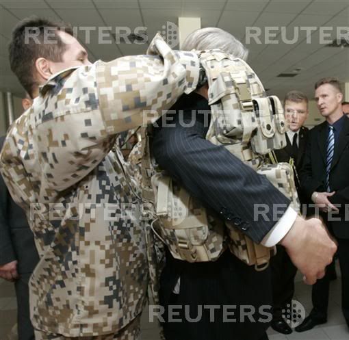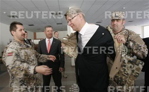 Latvia's President Valdis Zatlers (2nd R) wears an armoured waistcoat during his visit to Adazi military base, 15 km (10 miles) from capital Riga, August 31, 2007