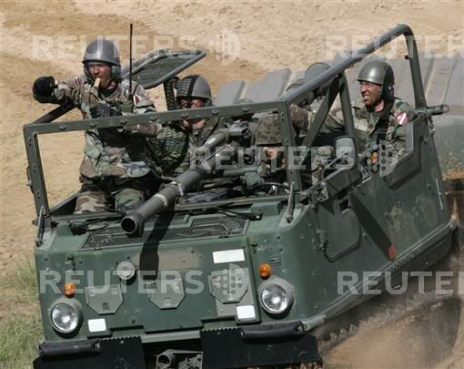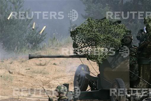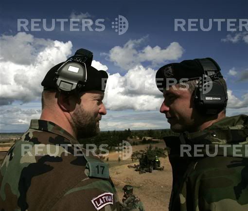 Latvian soldiers speak during the annual military exercise at Adazi military base, 15 km (10 miles) from the capital Riga August 31, 2007