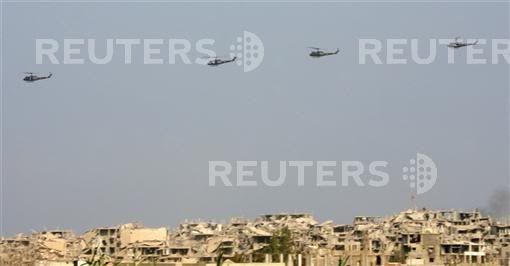 A Lebanese military helicopter convoy flies over the devastated buildings of the Nahr al-Bared refugee camp after the army control in north Lebanon September 3, 2007. Lebanese troops on Sunday seized control of a Palestinian refugee camp where they had been battling militants for more than three months, killing at least 31 fleeing fighters, security sources said