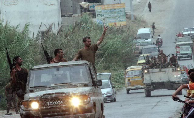 Lebanese soldiers leaving the Nahr el-Bared Palestinian refugee camp, stand on their armored personnel carrier surrounded by cheering residents as they celebrate the end of fighting in the northern city of Tripoli, Lebanon Monday, Sept. 3, 2007. Gunfire and explosions erupted near a Palestinian refugee camp in northern Lebanon on Monday as army units hunted militants on the run, a day after the final battle that crushed the group. (AP Photo/Hussein Malla)
