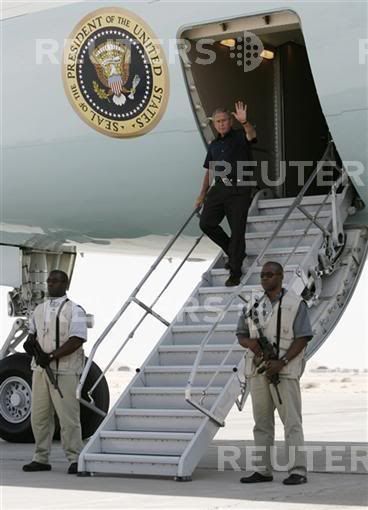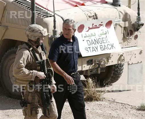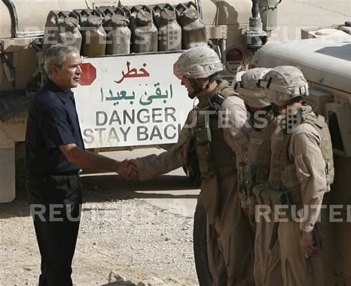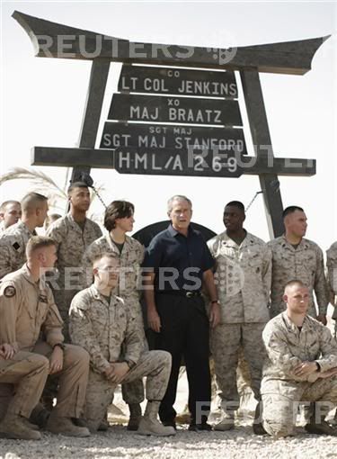 U.S. President George W. Bush poses with Marine combat troops during his unannounced visit to Al-Asad Air Base in Anbar Province, Iraq, September 3, 2007. Bush made a surprise visit to Iraq on Monday, just a week before his top officials in Baghdad present pivotal testimony to Congress that could influence future policy on the war