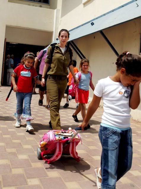 A female Israeli soldier holds hands with two Israeli school girls as they leave their 'reinforced' school in the southern Israeli town of Sderot, Israel, 03 September 2007. Earlier some six Kassam rockets, fired by Palestinian militants in the nearby northern Gaza Strip, landed in or near Sderot, one just outside a kindergarten. Israel is considering a large scale military operation inside the Gaza strip to stop the Kassam rocket attacks on civilians.