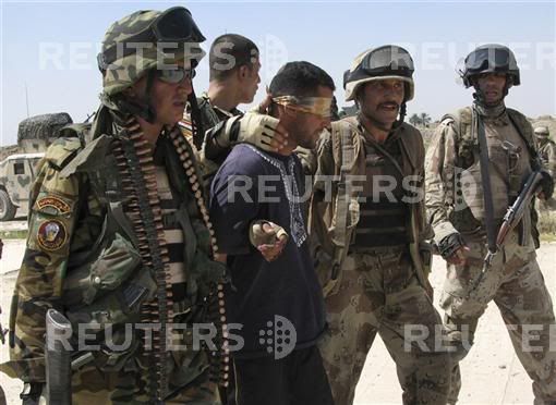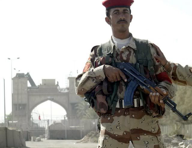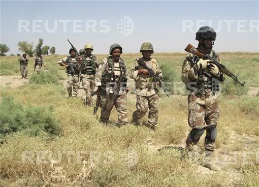 Iraqi soldiers secure an area while their colleagues and U.S. soldiers conduct raids nearby in central Baquba, 65 km (40 miles) northeast of Baghdad, September 1, 2007. An Iraqi army officer said that two suspected members of al-Qaeda were arrested during raids in Baquba by a joint U.S.-Iraqi military operation