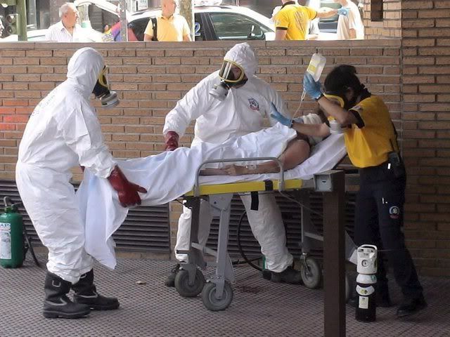 A woman is attended in the street by doctors and paramedic staff dressed in NBQ suits after a man threw a bottle of toxic liquid at her in Madrid, central Spain, 03 September 2007. The woman, 42, suffered second-degree burns. The attacker was her partner, witnesses said
