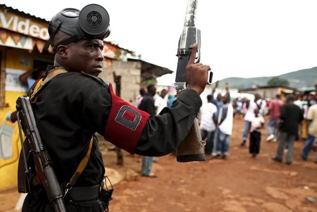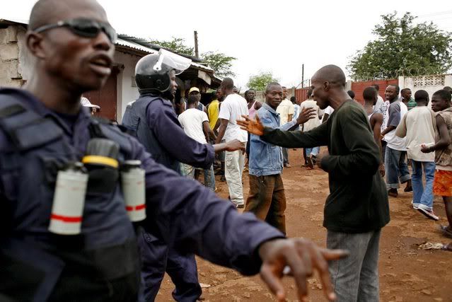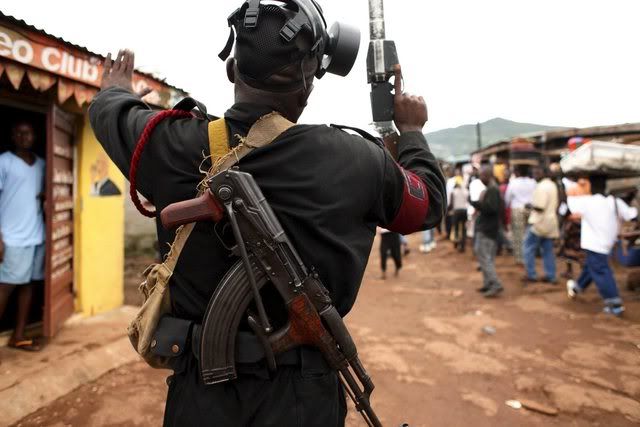 Sierra Leone security forces try to calm a growing crowd outside of a polling station in eastern Freetown as people begin to gather waiting for unofficial results in the run-off presidential elections in Freetown, Sierra Leone 08 September 2007. The presidential run-off is between the ruling party's candidate Solomon Berewa of the Sierra Leone People's Party (SLPP) and Ernest Bai Koroma of the opposition's All People's Congress (APC