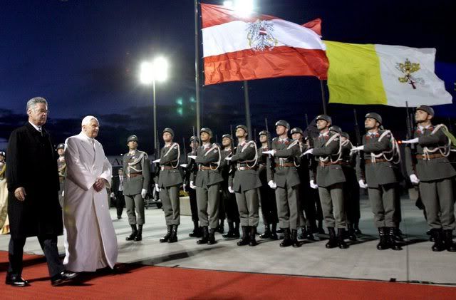 Pope Benedict XVI (2nd L) walks next to Austrian President Heinz Fischer (L) before he departs Austria 09 September 2007. The pope had come to Austria to celebrate the 850th anniversary of Mariazell, a major Austrian pilgrimage site. In his remarks directed at Austria‘s faithful, the pontiff sent a strong political message intended to remind Catholics of Christian values and morals