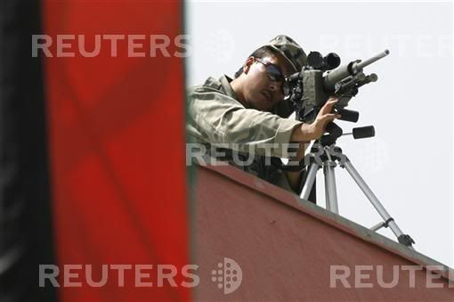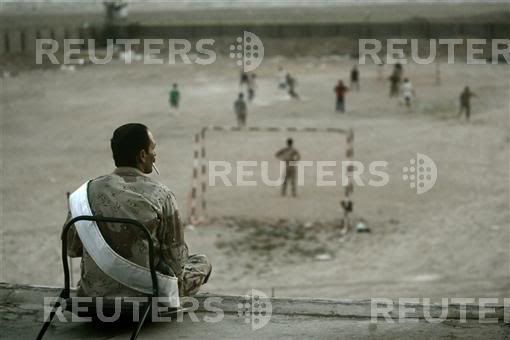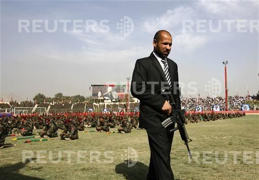 An Afghan guard keeps watch, as soldiers sit in the background, during a ceremony inside Kabul stadium September 9, 2007. Afghan President Hamid Karzai broke off from a speech and was escorted safely away from a ceremony at Kabul's sports arena on Sunday after shots were fired outside the stadium, a defence ministry spokesman said.