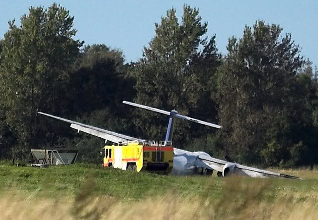 A passenger airplane from Scandinavian Airlines System is lying on its side after an emergency landing at the Aalborg Airport Denmark, 09 September 2007. The right wheel of the landing gear collapsed during landing and the plane carrying 75 passengers caught fire. No crew members or passengers were injured during the incident