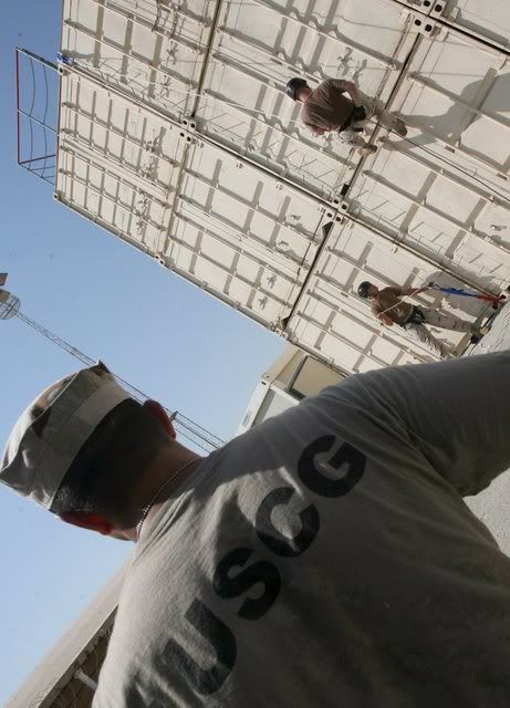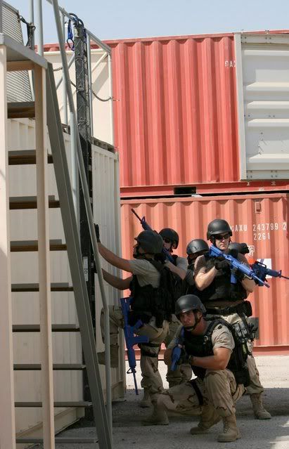 An image made available 09 September 2007 of members of the US Coast Guard tactical law enforcement team south conducting non-compliant vessel boarding exercises at their training facility in Manama, Bahrain, 06 September 2007. From the southern Iraqi off-shore oil platforms to the coastlines of the Northern Arabian Sea and East Africa, US Coast Guard cutters and sailors have been quietly involved for the past several years in protecting vital maritime infrastructures and training regional navies and police forces to better defend their sea boarders. Their involvement has focused on supporting the war effort in Iraq and carrying out Maritime Security Operations (MSO) alongside coalition navies to deny terrorists and smugglers maritime access