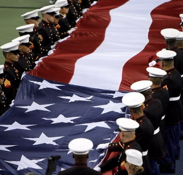 US Marines unfurl a giant American flag across center court during the opening ceremony for the women's final match on the thirteenth day of the 2007 US Open tennis tournament in Flushing Meadows, New York, USA, 08 September 2007. Justine Henin of Belgium will face Svetlana Kuznetsova of Russia.