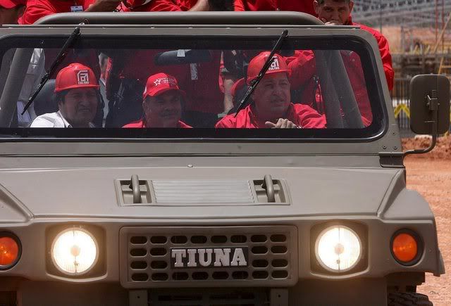 Picture realesed by Miraflores Press Office which shows Venezuelan President Hugo Chavez (R) drives a Tiuna, military vehicle fabricated in Venezuela, and his Bolivian counterpart Evo Morales (L) and an unidentified man (C), at the siderurgical industrial complex in Puerto Ordaz, Venezuela. Both Presidents signed an agreement to create a mixed company which exploits the Bolivian iron locations in Mutun, one of the biggest in the world