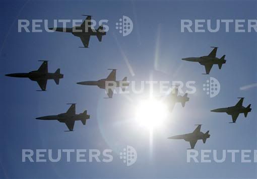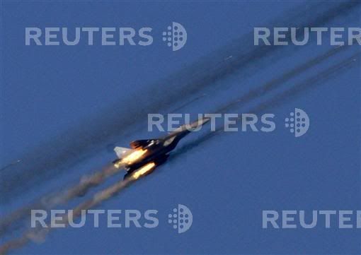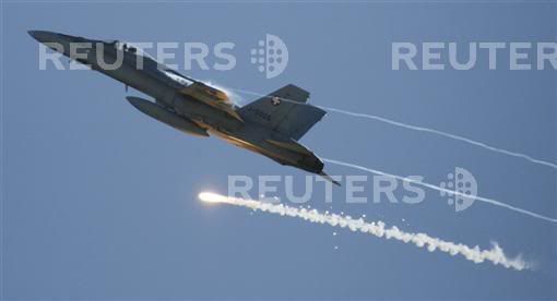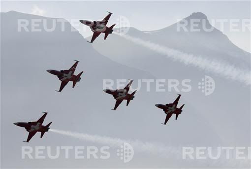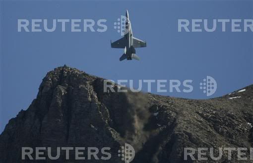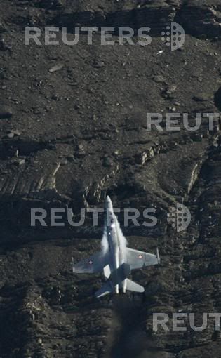 A F/A 18 Hornet of the Swiss Air Force fires flares during a performance at a flight demonstration of the Swiss Air Force over Axalp in the Bernese Oberland, October 11, 2007