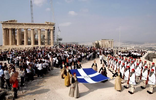 Members of the elite presidential honor guard, better known as Evzones, on right, stand at attention during a flag-raising ceremony on the Acropolis on 12 October 2007, which commemorated the 63rd anniversary of the liberation of Athens from German occupation forces during World War II