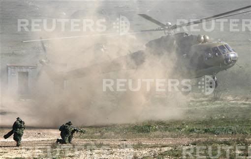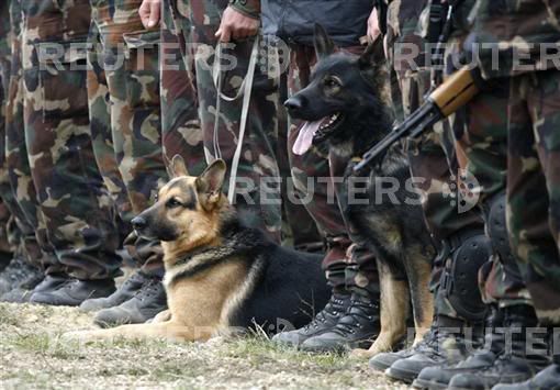 Soldiers with their dogs participate in a military exercise in Hajamasker, 120 km (75 miles) west of Budapest October 11, 2007. The exercise, involving some 1,000 military personnel, is testing the Hungarian army's upgraded defence capabilities, according to Hungary's chief of staff Andras Havril