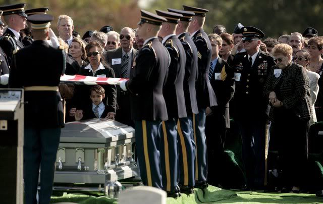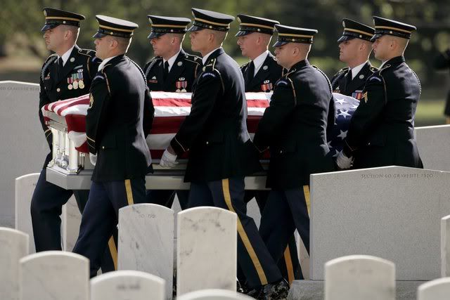 Family members of the victims of a Army National Guard helicopter crash in Iraq look on as military pall bearers fold the burial flag over the casket during a group interment ceremony at Arlington National Cemetery in Arlington Virginia USA on 12 October 2007. Twelve soldiers were killed on 20 January when their Black Hawk helicopter crashed in Baghdad. Their remains were buried together in one casket.