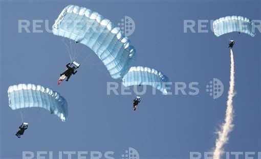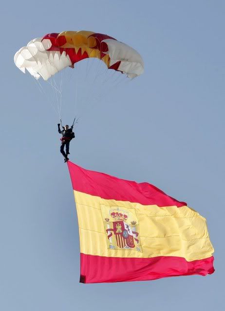 A Spanish army parachutist unfurls the Spanish national flag as part of the military parade celebrated on the occasion of Spain's national day in Madrid, 12 October 2007