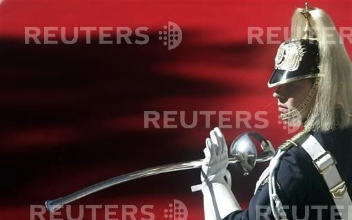 A member of the Portuguese honour guard awaits the arrival of Malawi's President Bingu wa Mutharika at Belem Palace in Lisbon October 11, 2007.