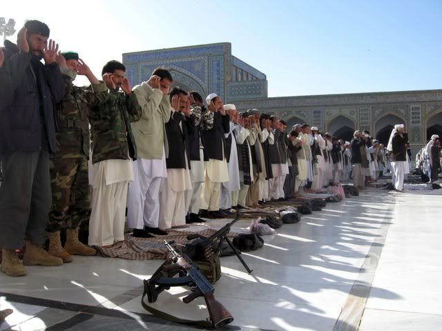 Afghan security officials offer Eid-ul-Fitr prayers along with other faithfuls at a Mosque in Herat Afghanistan 12 October 2007. Afghan Muslims today began to celebrate the Eid-ul-Fitr which marks the end of the holy fasting month of Ramadan