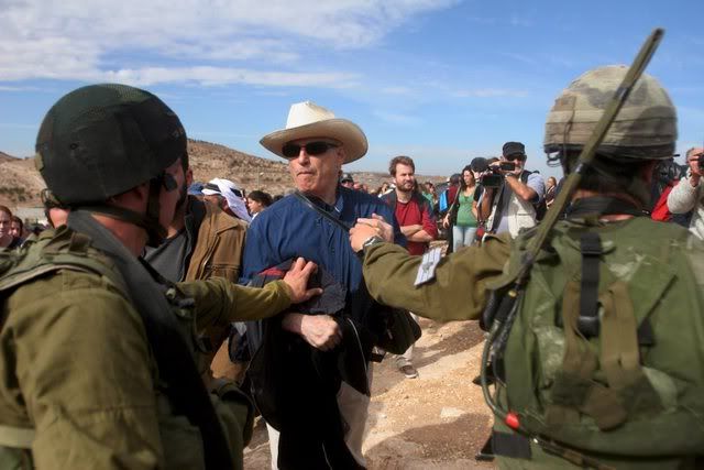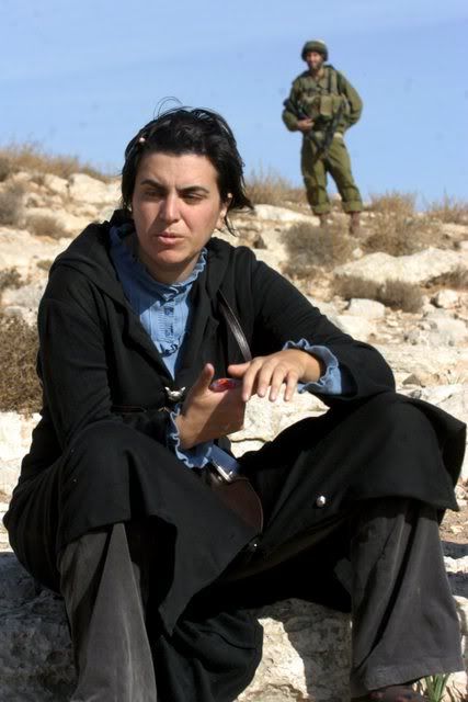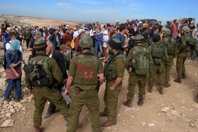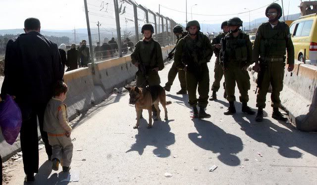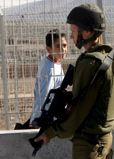 An Israeli soldier shouts at Palestinian demonstrators during a demonstration against Israeli checkpoints, at the Hawara checkpoint near the West Bank city of Nablus, Saturday, Dec. 1, 2007.