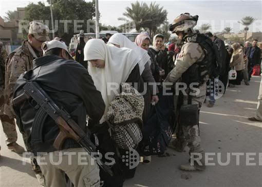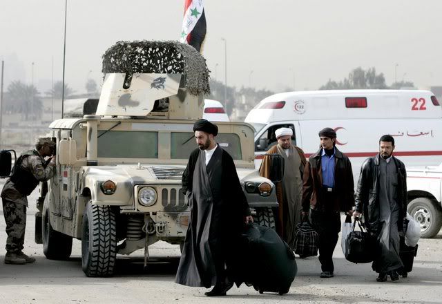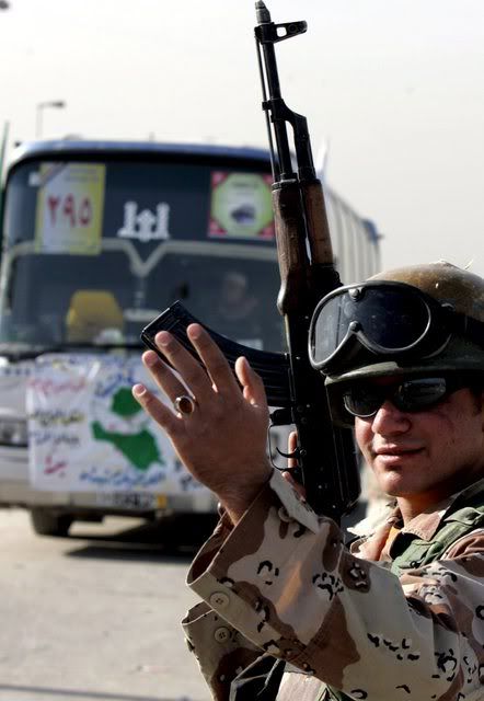 An Iraqi soldier guards Iraqi Muslim pilgrims preparing to board buses in Fallujah City for Mecca in Saudi Arabia to attend the annual religious Haj pilgrimage, Iraq on 02 December 2007. Pilgrims from all over the world gather in the holy city of Mecca each year for the five-day haj, which is a duty for every able-bodied Muslim at least once in a lifetime.