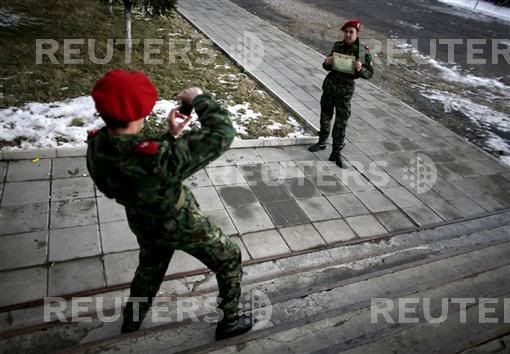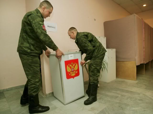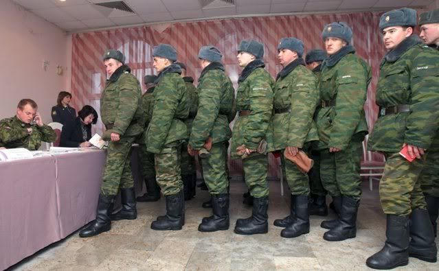 Russian soldiers stand in queue for the ballot papers at the polling station in Podolsk 30km from Moscow 02 December 2007. On Sunday Russian people vote to elect the fifth Russian State Duma, the lower house of parliament. Some 107 million people are eligible to elect 450 members to the Duma