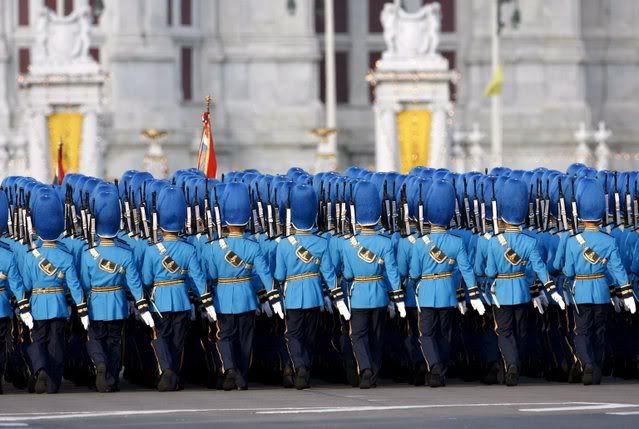 Thai royal guards of honour march during a parade to celebrate Thai King Bhumibol Adulyadej's 80th birthday in Bangkok, Thailand, 02 December 2007. The parade is an annual event to pledge allegiance to the crown and celebrate the world's longest reigning monarch. King Bhumibol will turn 80 years on 05 December 2007