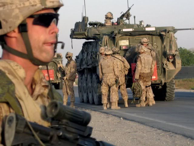 Canadian soldiers of NATO's International Security & Assistance Force (ISAF) secure the site of a suicide car bomb attack in Shawalikot district of Kandahar province, Afghanistan 02 December 2007. A suicide attacker detonated his explosive-filled vehicle near a NATO's convoy killing himself