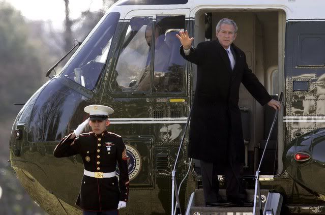 US President George W. Bush waves as he leaves the White House in Washington, DC USA on 25 January 2008. Bush is traveling to West Virginia to speak to Congressional Republicans