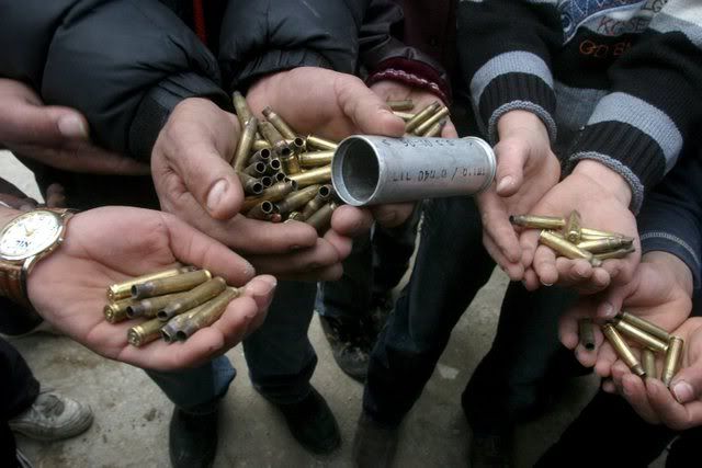 American-backed Sunni militia men inspect weapons and roadside bombs which their found while searching the area around Arab Jabour, outside Baghdad, Iraq, Friday, Jan. 25, 2008